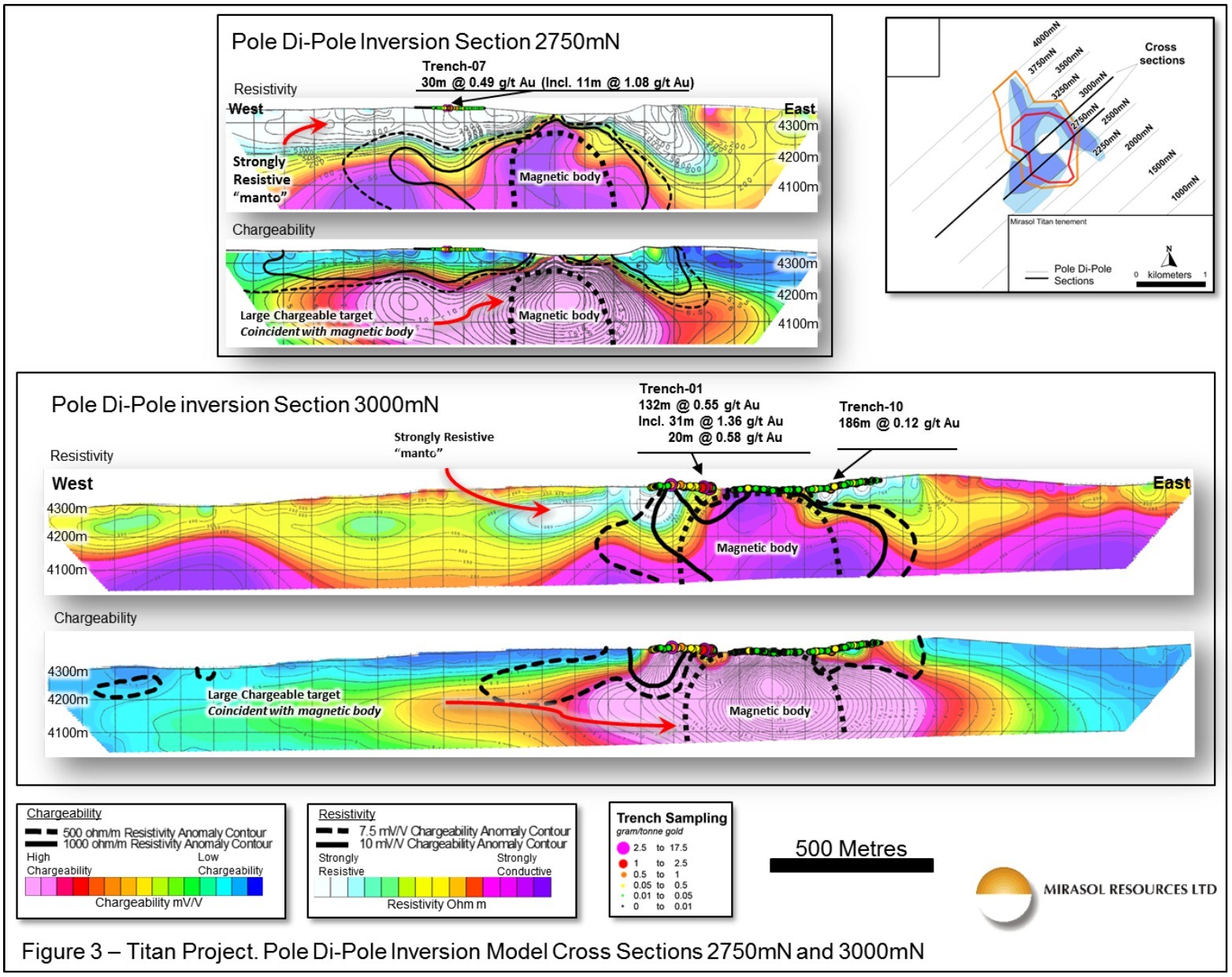 The processed cross-sections and 3-dimensional modelling of the PDP electrical geophysical survey (Figure 3 and Figure 4) show an interpreted covered, highly resistive (1000 to +2000 ohm/m) triangular- shaped tabular anomaly, up to 150 metres thick, developed over an area of 1500 by 1400 metres. The source of the resistive zone does not crop out in the Titan trenches and thus the nature of the resistor is unknown. A plausible explanation for resistive values of this magnitude may be concentrations of silica. Based on the Company's experience, Mirasol considers this to be a possible explanation for the resistive blanket at Titan and that this resistive anomaly represents a valid conceptual drill target for gold mineralization.