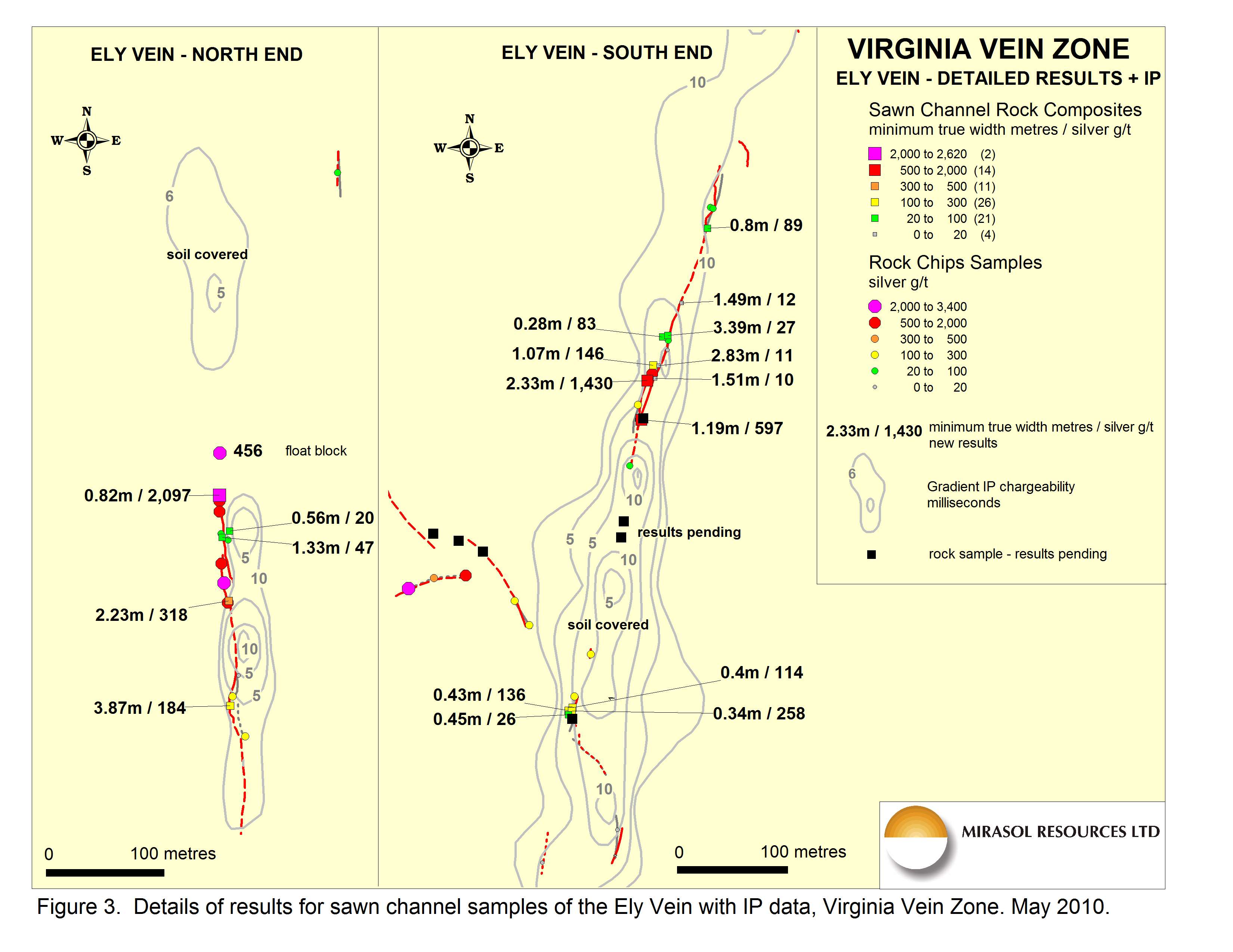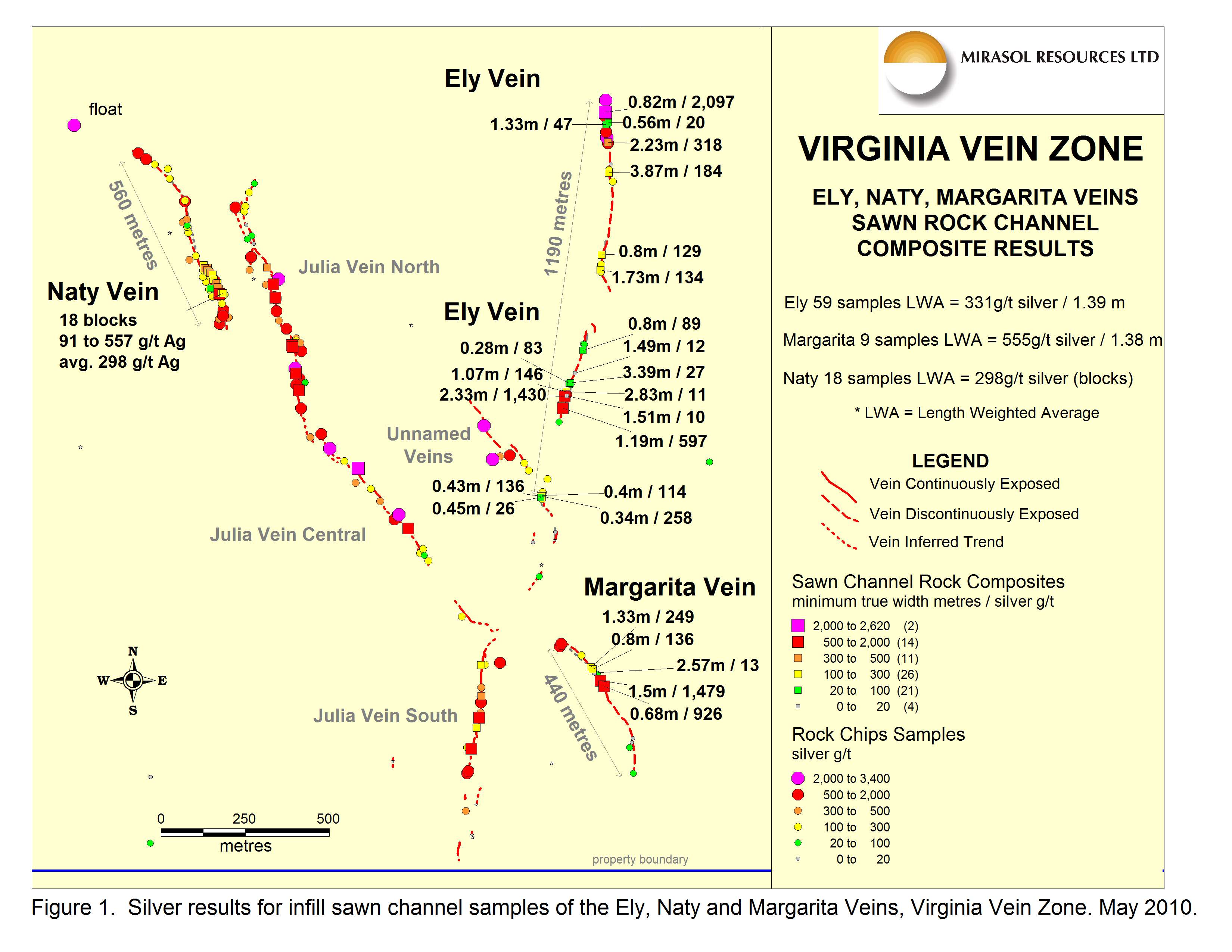 VANCOUVER, June 7 /CNW/ - Mirasol Resources Ltd. (TSX-V: MRZ, Frankfurt: M8R). New zones of high grade silver mineralization at the Ely, Margarita and Naty veins which flank the silver-rich Julia vein have been identified at the 100% Mirasol owned Virginia Vein Zone, Santa Cruz province, Argentina (see news releases of March 4 and April 13, 2010). Preliminary results from an extensive ground magnetic and gradient array IP geophysical survey at the Virginia Vein Zone have identified soil covered extensions of outcropping high grade silver veins. Current results increase the total length of well-mineralized veins and potential drill targets at the zone.