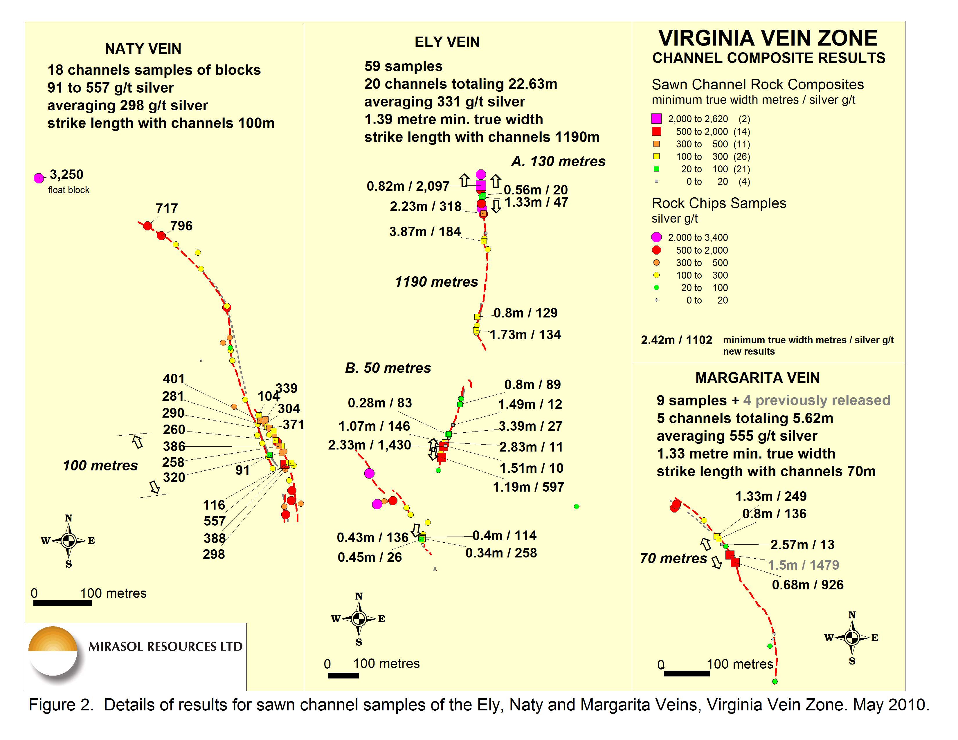"Exploration at the Virginia Vein Zone has confirmed high grade nature and extensions of silver-rich structures surrounding the Julia Vein, and we believe the results significantly expand the exploration potential. The application of systematic sampling combined with high quality geophysical data has increased the number of prospective drill targets at the Virginia Vein Zone. The property continues to present new opportunities and we look forward to receiving additional exploration results," stated Mary Little, Mirasol's President and CEO.