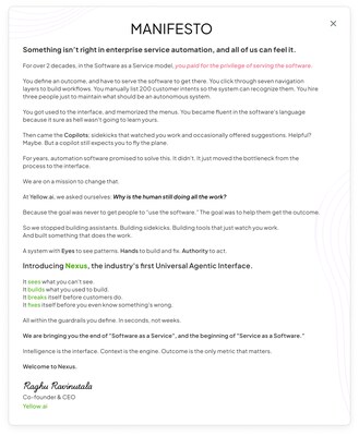 "We are ushering in the end of the copilot era," said Raghu Ravinutala, CEO & Cofounder of Yellow.ai. "For decades, enterprises paid for the privilege of serving their software--clicking, configuring, maintaining. Nexus inverts this model. You define the outcome. The software does the work. That's what we mean by 'Service as a Software'."